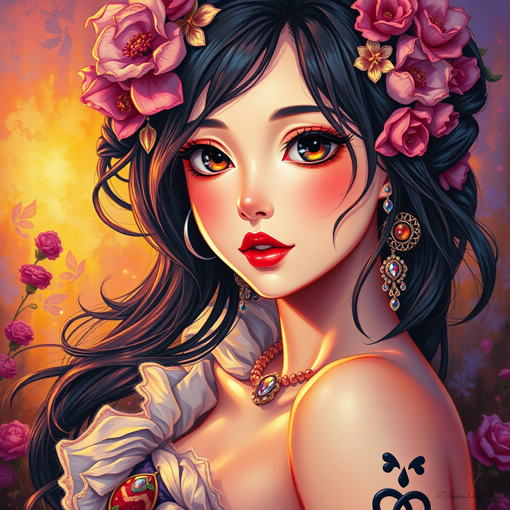 Vibrant acrylic illustration, stunning anime girl, rich oil painting, intense iridescent glow, floral adornments, dramatic chiaroscuro, divine cinematic edge lighting, baroque art influence –aspect ratio 2:3