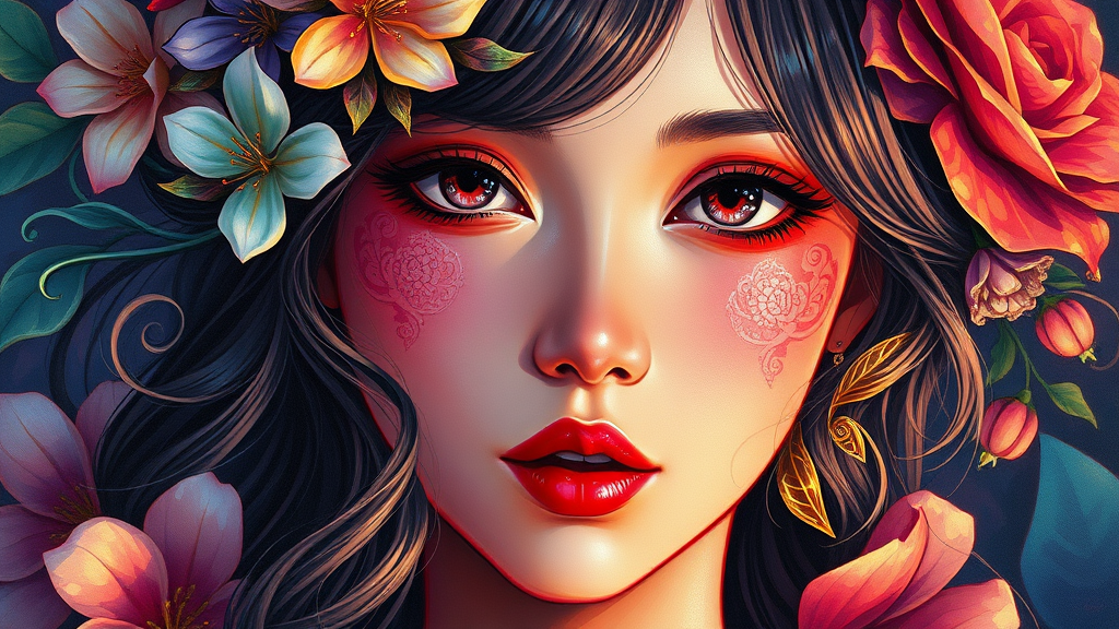 Vibrant acrylic painting of a stunning anime-inspired girl, showcasing radiant oil painting techniques, intense shimmering reflections, adorned with intricate floral accents, masterful use of chiaroscuro, divine cinematic rim lighting, influenced by opulent rococo artistry, aspect ratio 2:3.