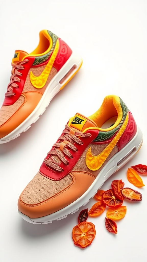 Vibrant and artistic depiction of Nike shoes crafted from colorful dried fruit skins, featuring a sleek design and exquisite detailing, showcasing bright and vivid colors with a modern, clean composition against a pristine background.