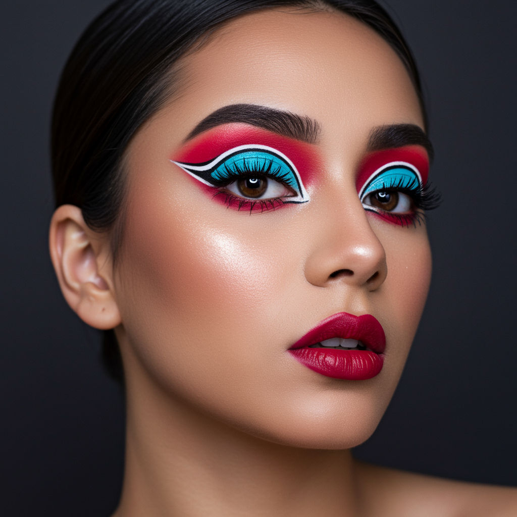 Vibrant and daring makeup artistry showcasing vivid eyeshadow and striking lips, incorporating imaginative and unique designs; focus on female portraiture with an emphasis on the rule of thirds; aspect ratio of 4:5; infuse with an unexpected flair of chaos at level 27; high quality level 2; style guidance score of 750; version 5; make subtle creative adjustments while maintaining the essence of bold and bright aesthetics.