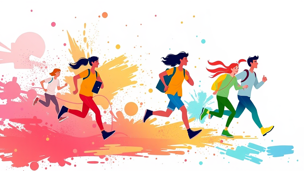 Vibrant and dynamic tourism scene with figures engaged in running amidst a burst of colors, set against a crisp white background. The illustration embodies a flat design with simple, streamlined shapes and a minimalist style, capturing the freshness and energy of exploration. Splashes of various hues create a lively and inviting atmosphere, emphasizing movement and the spirit of adventure in a modern, artistic presentation.