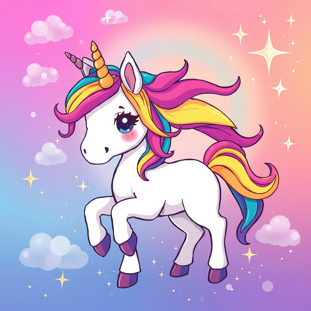 Vibrant and enchanting illustration of a unicorn, featuring a delightful array of colors. Rendered in a charming clip art style, the unicorn exudes a sense of whimsy and cuteness. Its mane flows with a rainbow of hues, set against a backdrop of fluffy clouds and sparkling stars, reminiscent of artworks found on ArtStation.