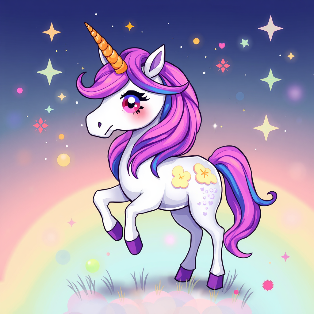 Vibrant and enchanting illustration of a unicorn in a whimsical clip art style, featuring a kaleidoscope of colors that evoke a sense of joy and wonder, with a touch of magic and playfulness reminiscent of charming Artstation artwork.