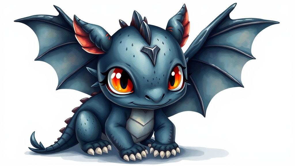 Vibrant and playful illustration, adorable miniature ebony dragon with large amber eyes and elegant wings, set against a clean white backdrop, rendered in a rich watercolor palette. The design exudes an ornamental flair with intricate shading, capturing a whimsical essence, while maintaining a moody, dark mode aesthetic.