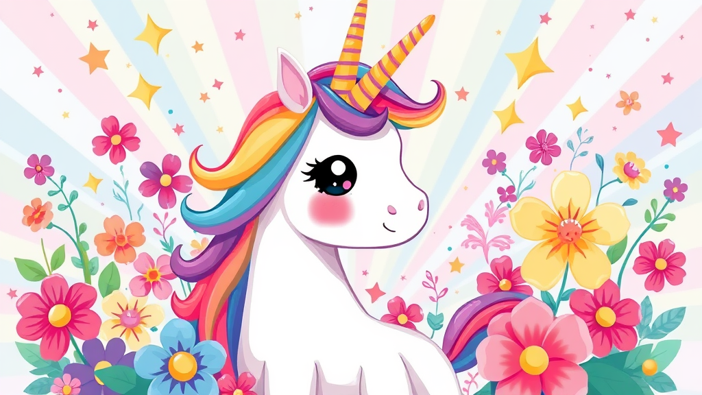 Vibrant and whimsical illustration featuring a charming unicorn with a rainbow mane, surrounded by a burst of colorful flowers and stars, designed in a playful clip art style, exuding joy and cuteness, akin to an artstation masterpiece.