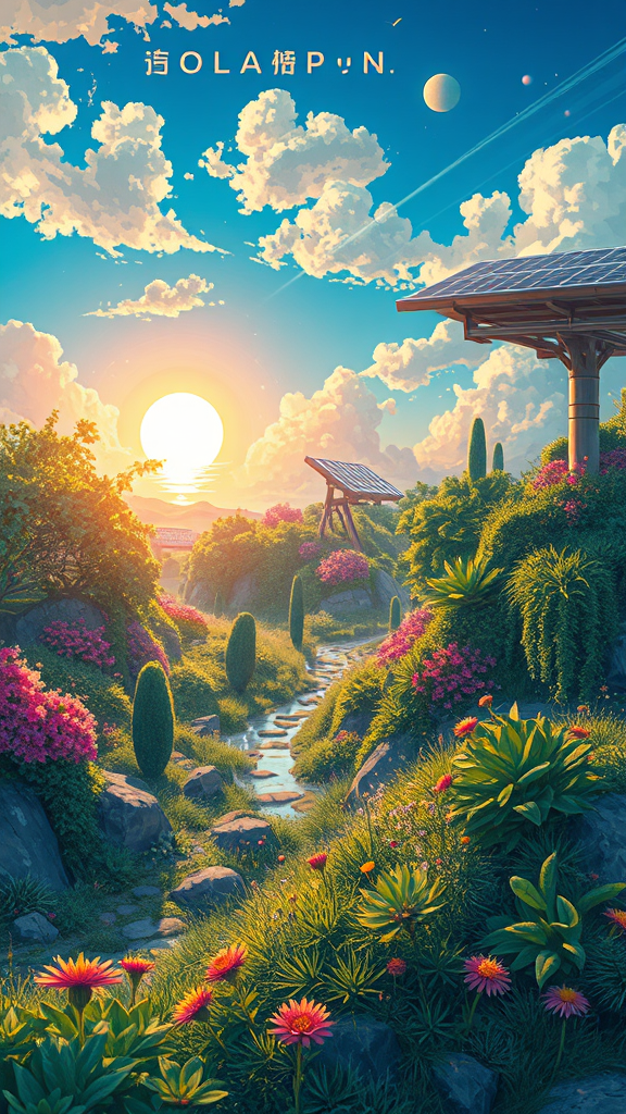 Vibrant anime artwork of a solarpunk summer day, inspired by the styles of Tim Okamura, Victor Nizovtsev, Greg Rutkowski, and Noah Bradley. Trending on ArtStation, 8k resolution, a true masterpiece with graffiti elements, showcasing fine and intricate details. Bursting with color and featuring a harmonious composition. The scene captures a serene and futuristic landscape, populated with lush greenery and sleek solar technology. Creative and surreal elements subtly integrated into the design, sparking imagination and wonder. A vision of a harmonious future, where nature and technology coexist beautifully.