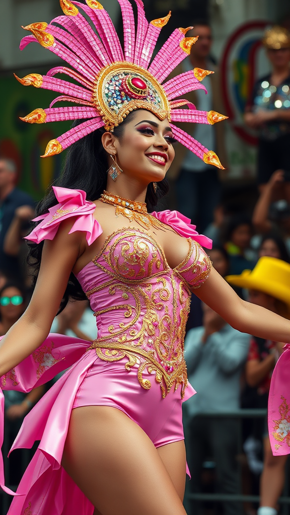 Vibrant artistic photography of a stunning woman adorned in pink and gold, captivating the crowd at Rio Carnival with her mesmerizing performance. The scene bursts with colorful mosaics and a chrome-plated sheen, exuding joy and optimism. Her hourglass figure is accentuated by bold lines, a mix of plastic and intricate embroidery adds depth to her costume, celebrating her radiant presence in the lively festivity.