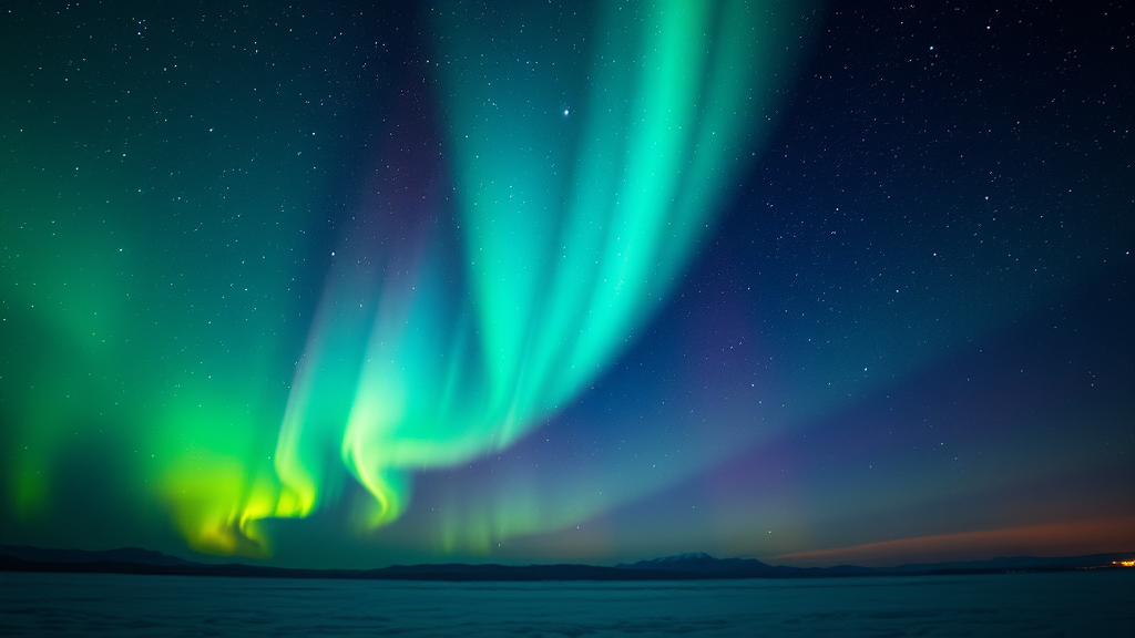 Vibrant aurora borealis illuminating the night sky, a tapestry of shimmering colors intertwined with countless stars, captured in exquisite hyper realism. Imagine the scene shot on 65mm film with a prolonged exposure, highlighting the ethereal dance of celestial lights across a vast expanse. Delicate hues of greens and purples ripple through the atmosphere, while the tranquil darkness of night offers a perfect backdrop, creating a supremely vivid and breathtaking portrayal of nature's nocturnal artistry.