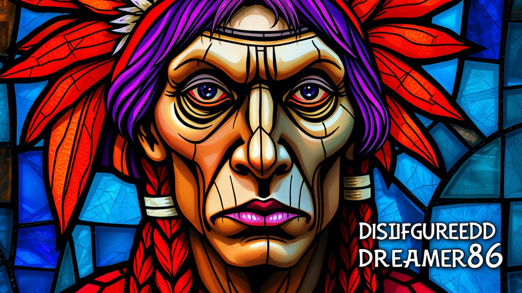 Vibrant azure and scarlet stained glass mosaic of a warped North American Indian portrait, digital mutation resulting in disfigured, elongated face with crossed and wonky eyes, excessive orange locking hair, iridescent skin with tawny undertones, extruded fingers, mutated hands, distorted, disfigured, cross-eyed, lazy eyes, vibrant purple streaked hair, superimposed low-res pixelated clone, watermarked with a grotesque, distorted, crude drawn logo, letters from 'disfigureddreamer86' in a twisted, irregular font, images overlapping, and in need of repair and resolution boost to its 8K resolution with HDR, overly sharp, cartoonish, cut-off, cropped, poorly lit, low-res high-contrast image of a Native American in a digitally mutated state, warped, with a hauntingly broken, ghostly aura surrounding their image, superimposed, distorted, logo, text and symbols at the bottom right, logo distorted to fit horizontally