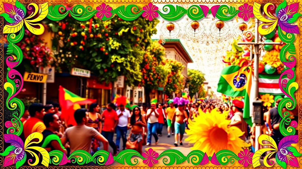 Vibrant background adorned with festive borders reflects the exuberance of the Brazilian Carnival, capturing the essence of celebration with a dynamic array of colors and patterns, featuring swirling motifs and rhythmic shapes that evoke the lively spirit of samba and joyous parades, all set in a captivating 9:16 aspect ratio.
