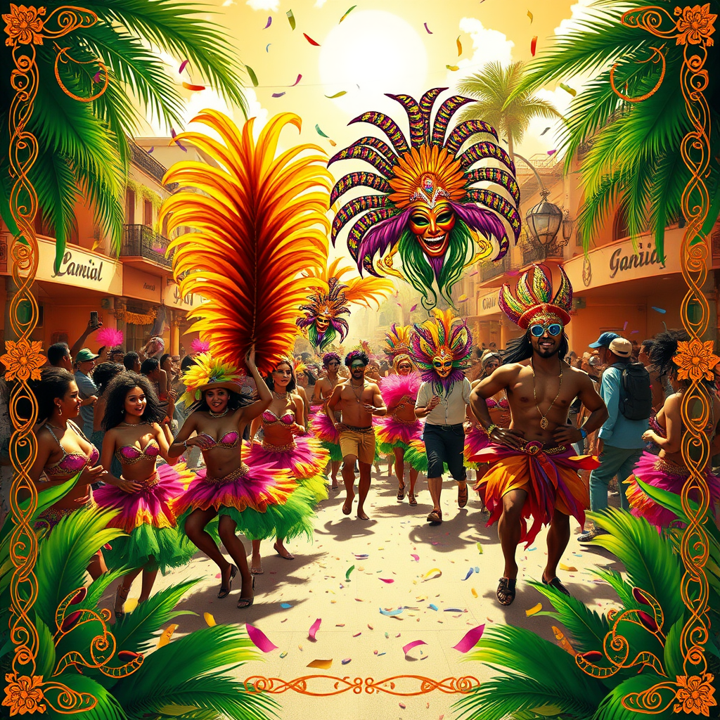 Vibrant background with intricate borders depicting a festive Brazilian carnival scene, featuring energetic dancers in colorful costumes, lively samba musicians, and cascading confetti, all set against a bustling street party. Tall feathers and ornate masks add to the grandeur, with warm hues of gold, green, and purple enhancing the joyous atmosphere. Sunlit skies and tropical elements frame the celebration, capturing the essence of this spirited cultural event. Aspect ratio is 9:16.