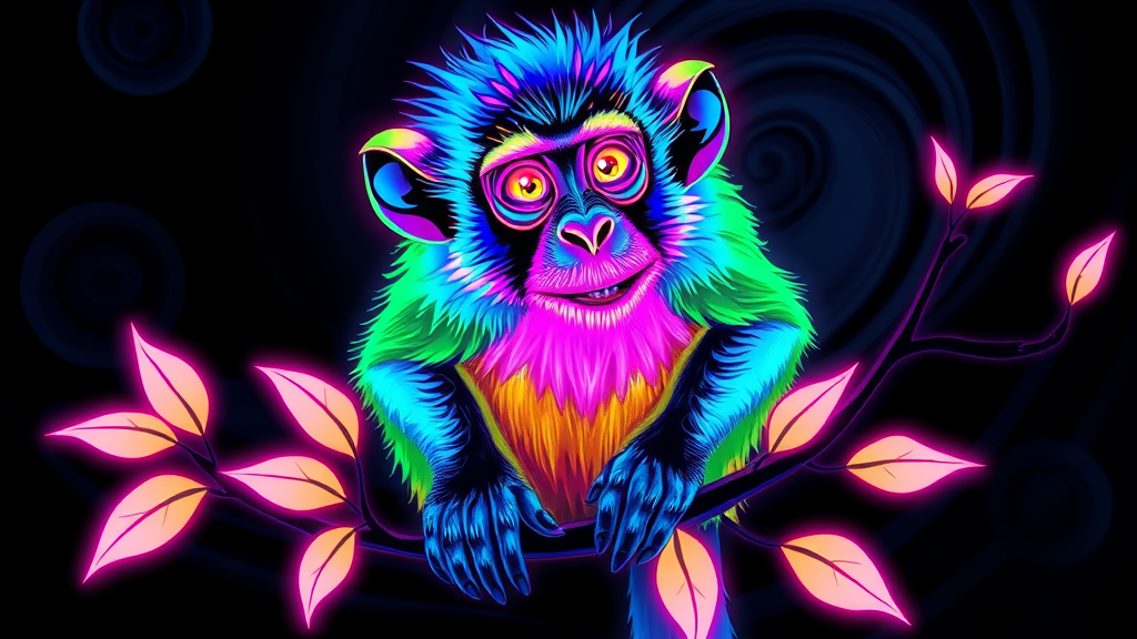 Vibrant blacklight illustration of a monkey with neon colors accentuating its fur, glowing in electric blues, pinks, and greens. The monkey is perched on a branch with luminescent leaves, set against a dark, swirling backdrop that highlights the radiant hues. Its eyes shine with an otherworldly luminescence, blending curiosity and wisdom, while playful patterns ripple across its face, giving it an ethereal, mystical feel.