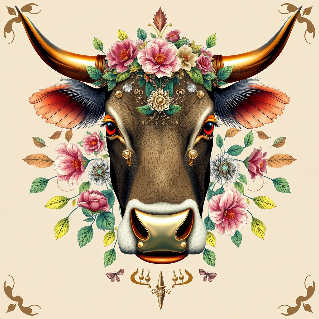 Vibrant botanical steampunk illustration of a realistic cow face, symmetrical design, inspired by the style of William Morris, featuring intricate floral motifs and a Victorian background. The artwork is highly detailed with elegant floral elements and leaves, incorporating V-ray rendering for a 3D effect. The cow's features are interwoven with shiny metal elements and a subtle mace accent, creating a harmonious blend of organic and mechanical elements.