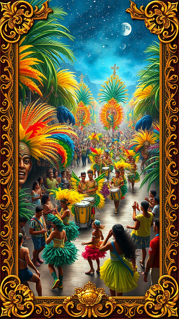 Vibrant Brazilian carnival festivities scene, adorned with intricate, ornate borders; colorful costumes and lively samba dancers in the foreground, a parade of musicians and flamboyant floats; rich patterns and textures create an atmosphere of joy and energy, vivid hues of gold, green, and blue dominating the palette; a tall, narrow aspect capturing the dynamic movement and festive spirit; rhythmic drumming and euphoric crowd in the background, surrounded by a dazzling array of feathers and sequins under a starlit sky.