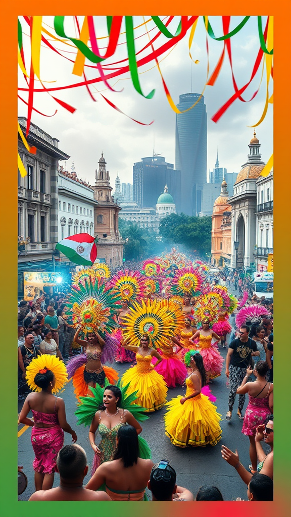Vibrant Brazilian Carnival scene with colorful borders, showcasing a lively parade filled with dancers in elaborate costumes, samba music filling the air, and a joyful crowd celebrating. The background features iconic Brazilian landmarks, and the festive atmosphere is illuminated by bright lights and streamers, creating a captivating and dynamic visual.