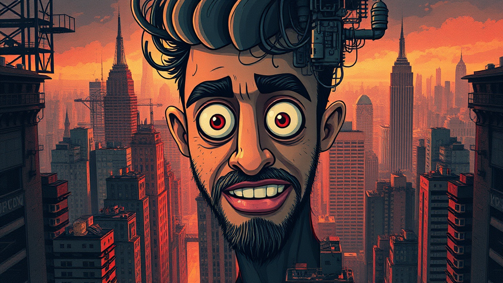 Vibrant cartoon face enmeshed in an intricate cityscape, inspired by Tim Doyle's style with layered industrial motifs and an abundance of subtle details, featuring rich, dark textures, solarized effects reminiscent of Agustín Fernández, designed as a captivating poster art, with an elongated aspect ratio of 36:55, enhanced by a stylized approach with an artistic flair.