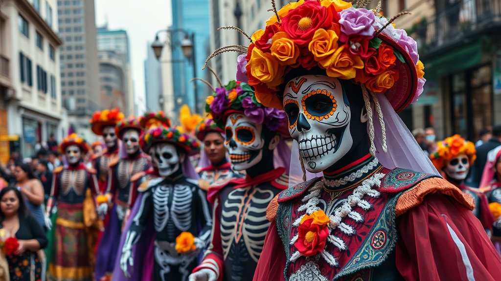 Vibrant Celebration of Día de los Muertos in Mexico City, capturing the lively parade with high-resolution, ultra-realistic detail, showcasing intricately painted faces, colorful costumes, and elaborate altars, set against a dynamic city backdrop, infused with a sense of joyful remembrance and cultural richness.