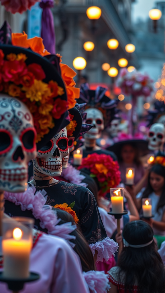 Vibrant celebration of Dia de los Muertos Parade in Mexico City, high-resolution photography, hyper-realistic depiction of intricate sugar skulls and traditional costumes, lively atmosphere with colorful marigolds and flickering candlelight, capturing the essence of cultural heritage and joyous remembrance among the bustling crowd, dramatic lighting and detailed textures enhancing the scene, with a touch of artistic flair and visual storytelling.
