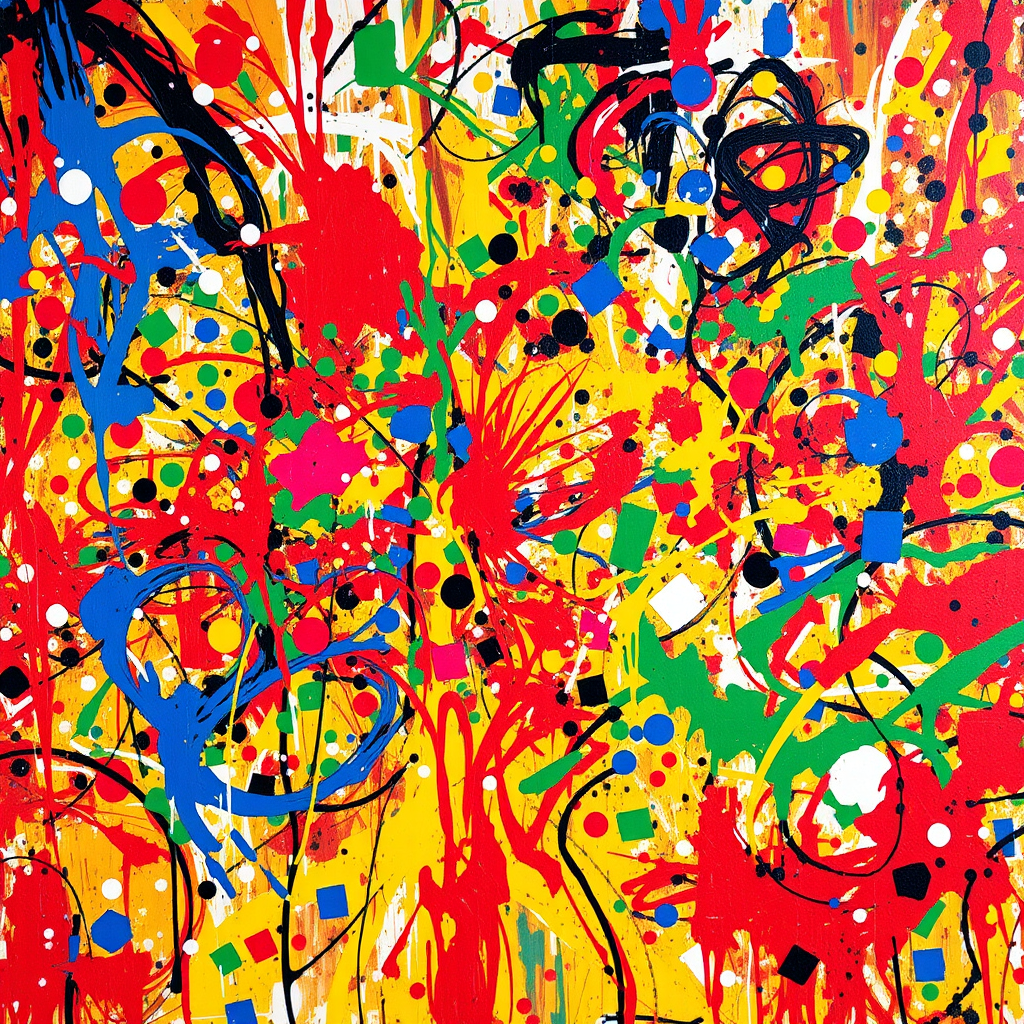 Vibrant chaos in swirling colors, a self-interpretation of an abstract mind; splashes of emotion in tumultuous harmony where the essence of Jackson Pollock manifests through bold strokes and erratic forms, capturing the dynamic and frenetic energy of the artist's spirit amidst a backdrop that speaks in whispers of both control and abandon.
