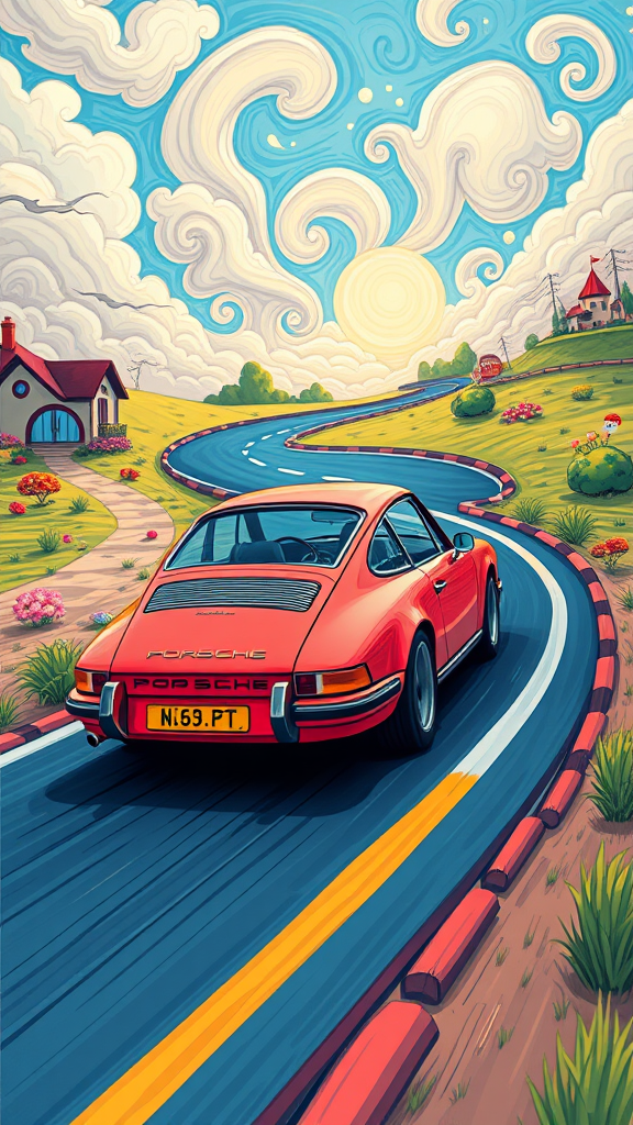 Vibrant, childlike depiction of a Porsche 911 speeding along a winding road, with exaggerated curves and bright, bold colors capturing its essence and motion, surrounded by a whimsical landscape filled with playful elements and a sky full of swirling clouds.
