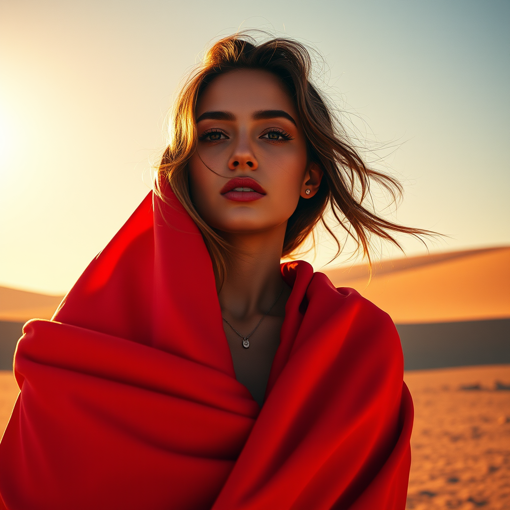 Vibrant commercial photo of a stunning Instagram fashion model elegantly wrapped in a striking red garment, captured in the style of vivid geometrics. The image draws inspiration from Guy Aroch and Helene Knoop, with intricate details presented in Unreal Engine 5. The scene is bathed in glowing pastels and sun-soaked colors, featuring bold, dynamic lines. Shot with the clarity of Fujifilm X-T4 and the precision of a Sony FE 85mm lens, the composition exudes a bright, lively atmosphere, maintaining a raw, unfiltered essence.