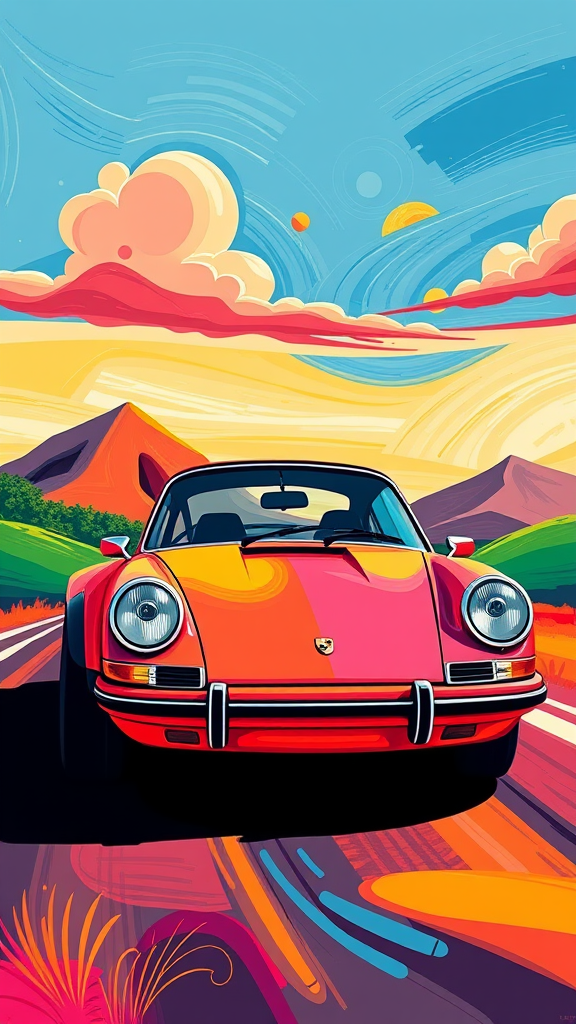 Vibrant depiction of a Porsche 911 in a naive art style, showcasing the car with bold, exaggerated shapes and bright, dynamic colors that capture its iconic curves and energetic essence in an imaginative, whimsical landscape.