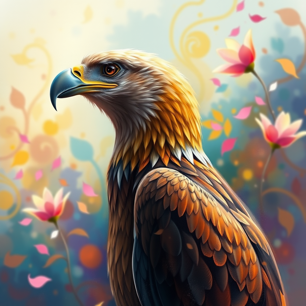 Vibrant depiction of an eagle from a side angle, emphasizing its elongated beak and focused gaze, set against an abstract, colorful background. The scene bursts with hues reminiscent of blooming flower petals, swaying gently in an imagined breeze, evoking a sense of fantasy and wonder.