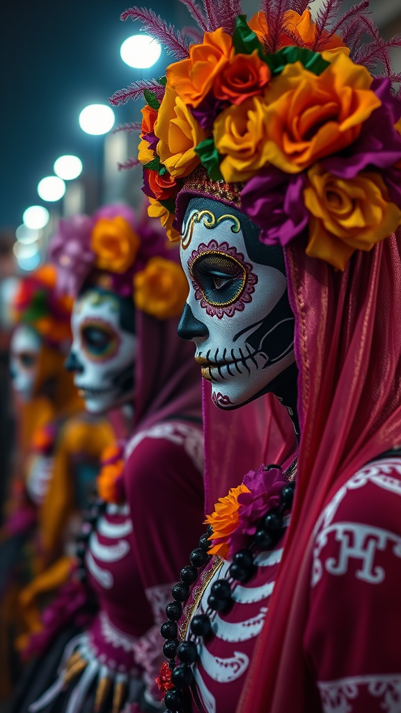 Vibrant Dia de los Muertos festival in Mexico City, ultra-realistic photography capturing intricate costumes and face paint, atmospheric night setting, high-resolution details, --ar 1:2 --stylize 700 --v 6.1
