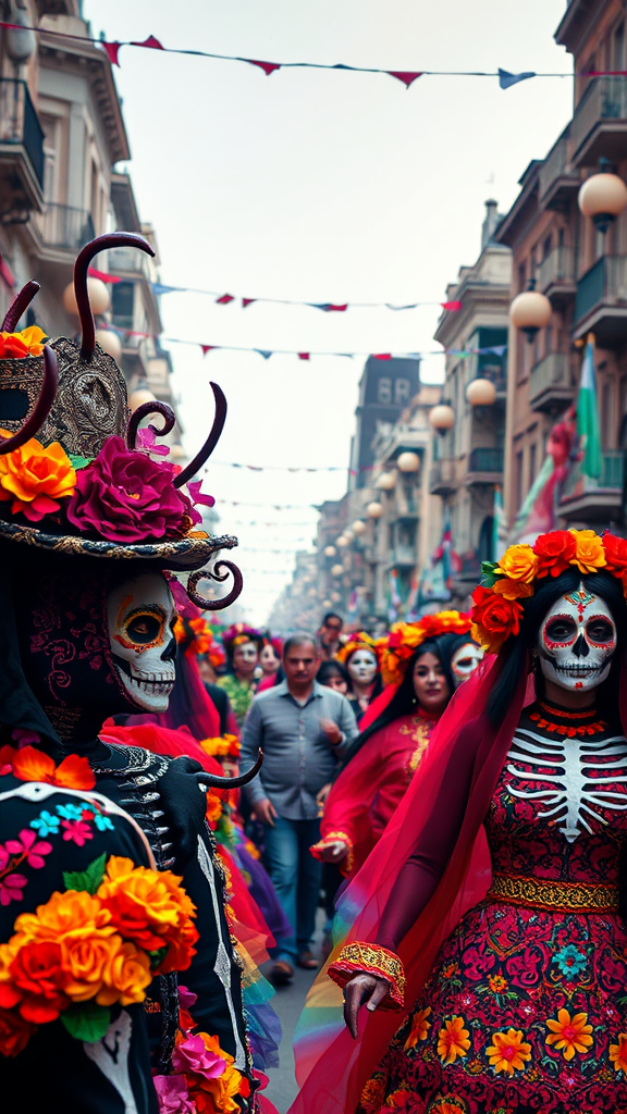 Vibrant Dias de los Muertos Festival in the heart of Mexico City, capturing the lively parade with intricate costumes, vibrant face paint, and traditional altars, ultra-realistic high-definition photography, capturing the essence and energy of the celebration with enhanced textures and vivid colors, atmospheric depth --ar 1:2 --stylize 750 --v 6.1.