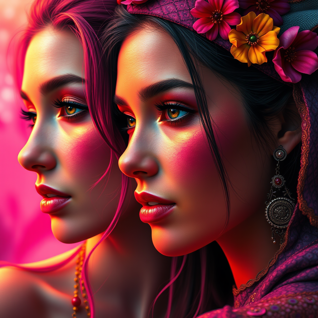 Vibrant digital art design featuring two women, crafted in the style of colorful fantasy realism, inspired by the works of Ivanovich Pimenov and Tanya Shatseva. The composition is a close-up shot, highlighting rich hues of magenta and amber, with elements of exotic realism. The image is rendered with ultra-high definition, capturing intricate details and textures. The artwork embodies a harmonious blend of fantastical and realistic elements, offering a stunning visual experience within a 3:4 aspect ratio, and embracing a raw, authentic style.