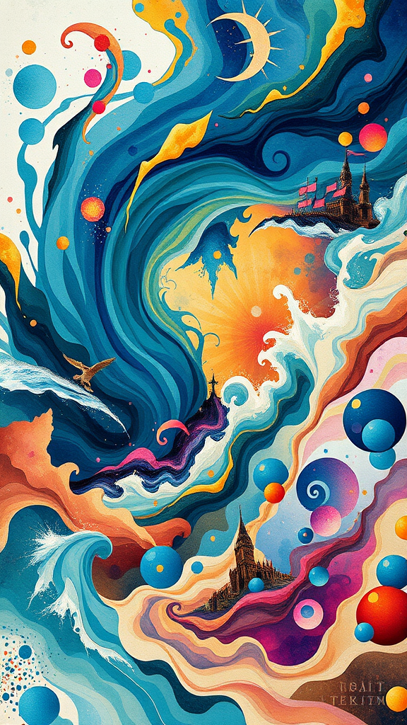 Vibrant digital collage art in the style of Sam Guay, with colorful bursts inspired by Serge Marshennikov, featuring emotive watercolor nuances. A fluid figurative scene in cyan and bronze, encompassed by swirling vortexes, set in a 4:5 aspect ratio, showcasing dynamic energy and imaginative landscapes.
