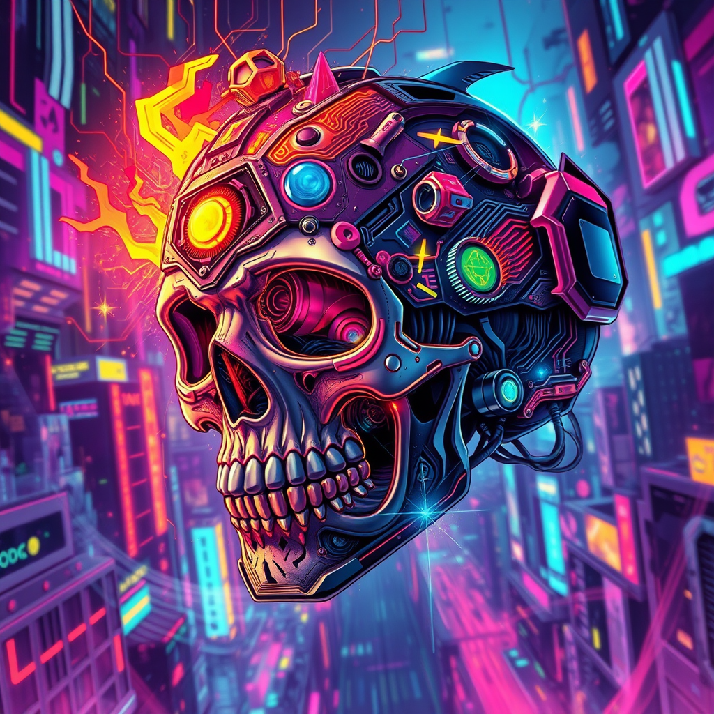 Vibrant digital illustration of a futuristic cyberpunk skull encased in intricately designed armor, featuring maximalist detailing with an explosion of colors, glowing elements, and intricate circuitry patterns weaving across its surface, set against a dynamic and abstract neon cityscape background, capturing the chaotic energy of a high-tech world.