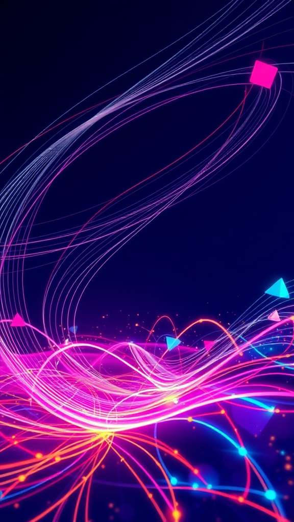 Vibrant digital landscape with dynamic swirling lines representing connectivity, interspersed with abstract geometric shapes in a spectrum of colors symbolizing data flow, set against a deep indigo backdrop to evoke a sense of infinite possibilities and technological artistry.