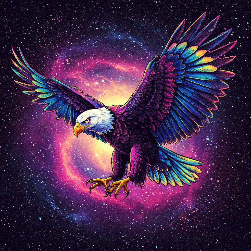 View this AI-generated image featuring vibrant eagle soaring through a cosmic dreamscape bathed in a kaleidoscope of neon colors rendered in a dynamic comic book style the eagle s feathers shimmer with shades of electric blues pulsating pinks and radiant yellows against a backdrop of swirling galaxi