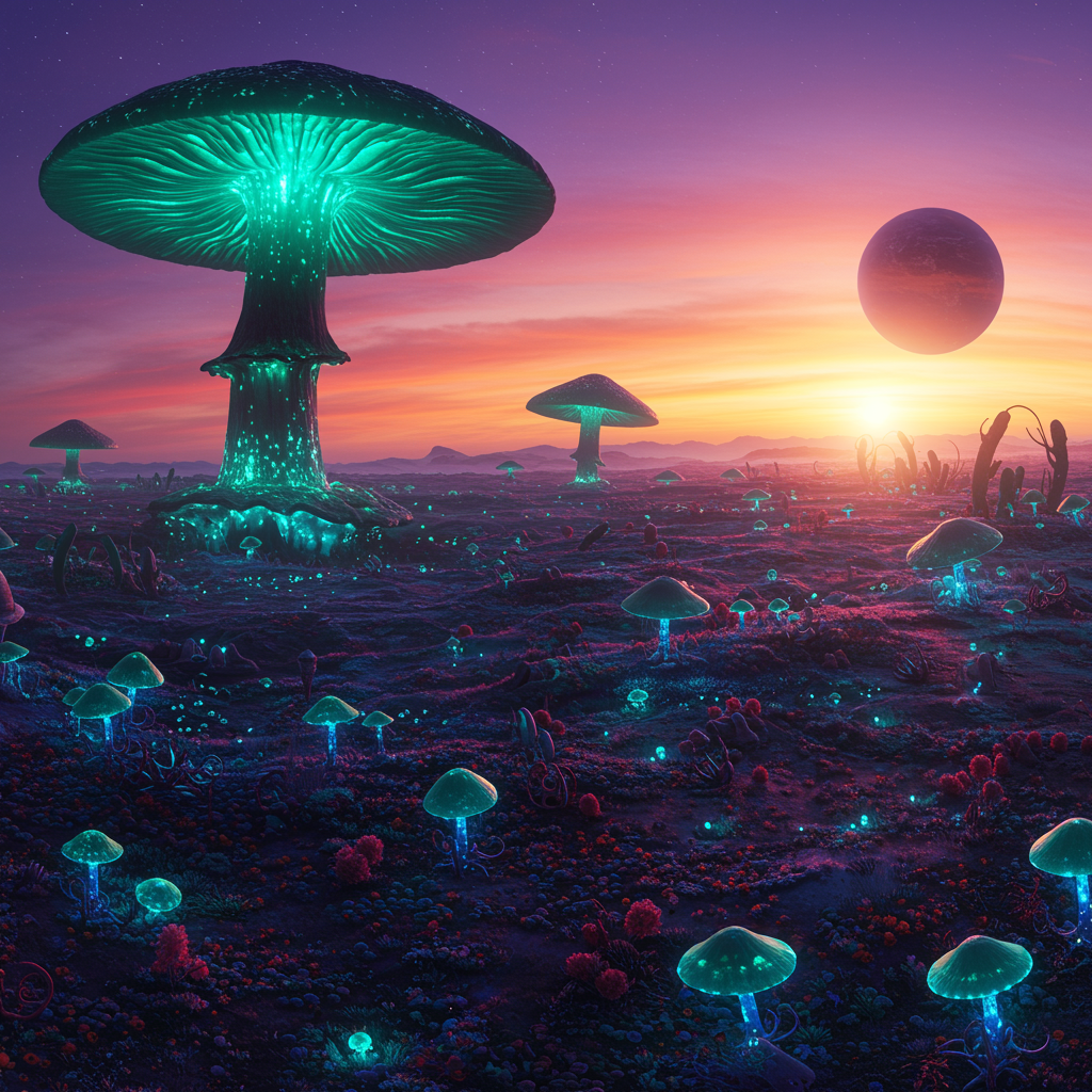Vibrant Earth, where continents drift in ever-changing formations, giant bioluminescent fungi illuminate the night, and seasons shift unpredictably, fostering diverse ecosystems that merge and evolve continuously.