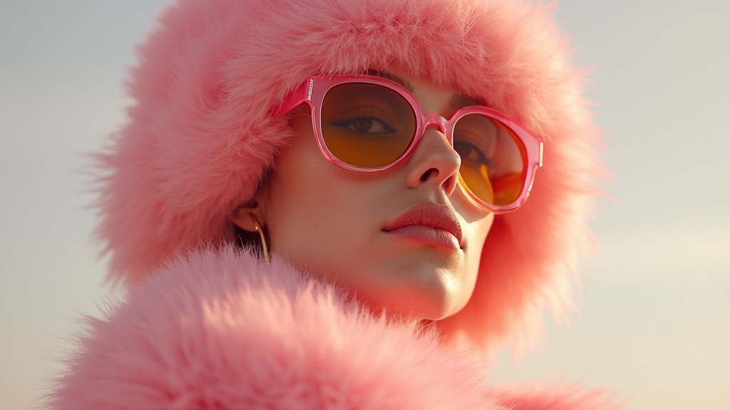 Vibrant fashion editorial featuring a collaboration between Jacquemus and Moncler: soft blush translucent fur sunglasses, ultra-realistic detailing, high-resolution 8k imagery with subtle creative flair, capturing an avant-garde aesthetic with a modern twist.