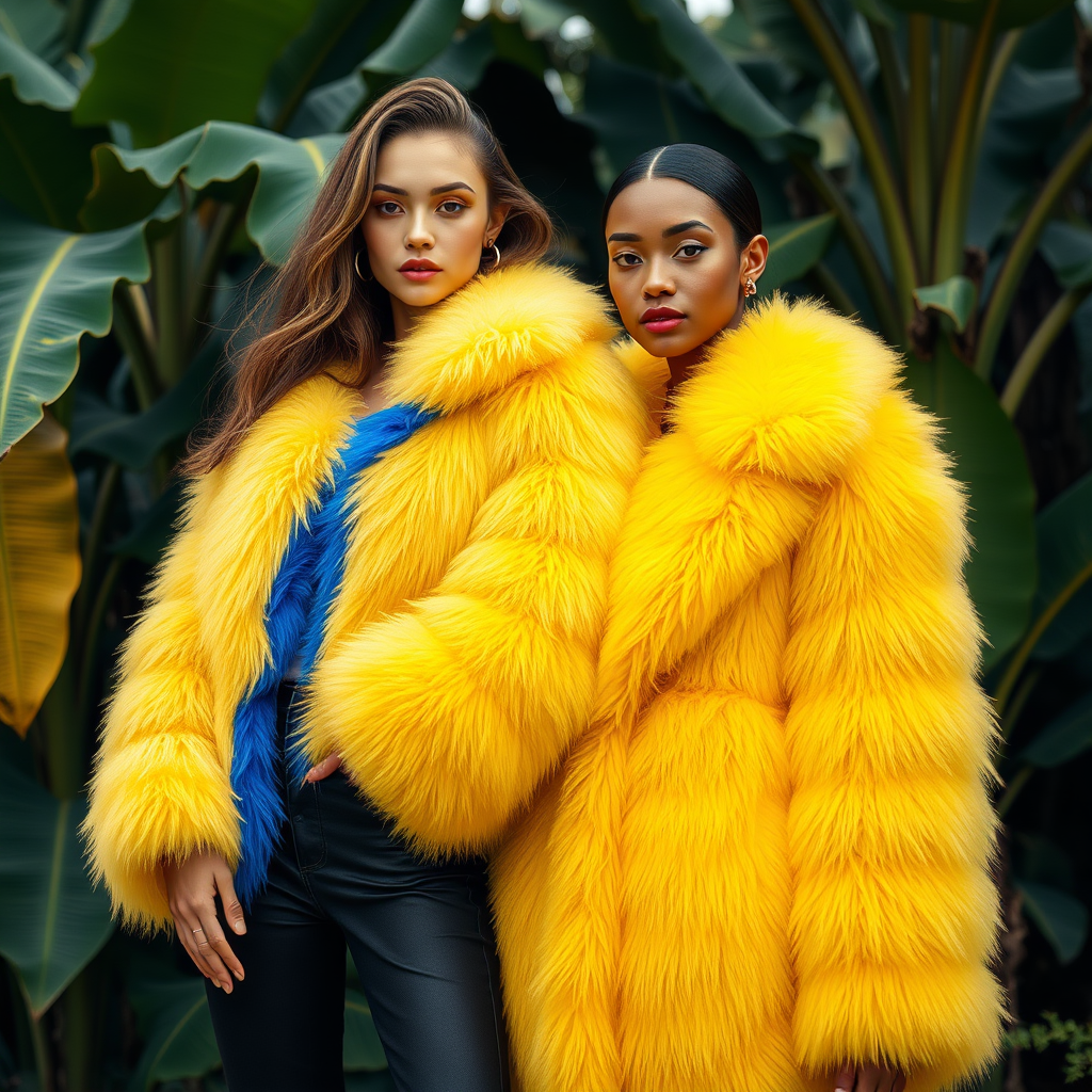 Vibrant fashion editorial, two female models, luxurious yellow and cobalt blue faux fur coats, lush banana plantation backdrop, exquisite professional photography, ultra-high definition, premium fashion brand, hyper-realistic detail, captured in 8k resolution, vivid imagery, artistic elegance, dynamic composition, creative flair.