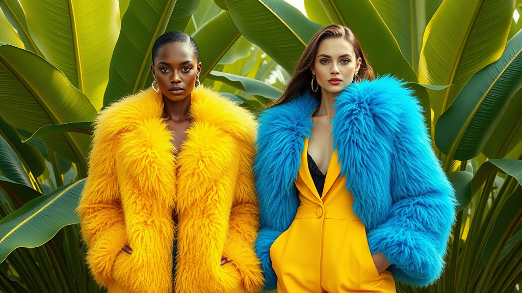 Vibrant fashion editorial, two striking female models, one in a luxurious yellow fur coat and the other in an electric blue fur coat, set amidst a lush banana leaf grove, captured through elite professional photography, ultra-high resolution clarity, iconic brand essence, lifelike photorealism, 8k quality, with a cinematic 4:5 aspect ratio for dramatic effect.