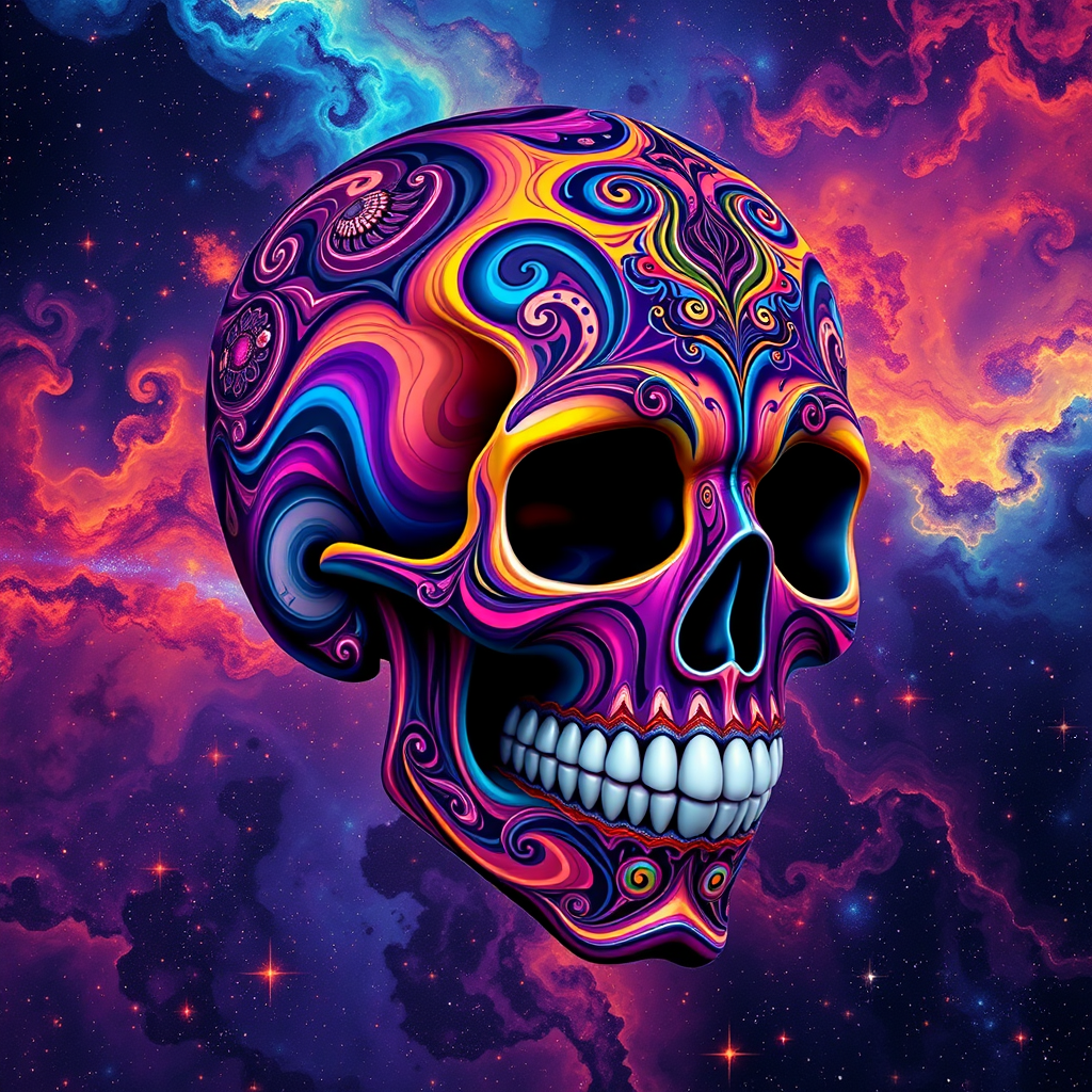 Vibrant ferrofluid skull infused with swirling patterns, adorned in the style of Dia de Muertos, set against a cosmic backdrop of vivid nebulae, enhanced with psychedelic LSD-inspired hues and intricate detailing.