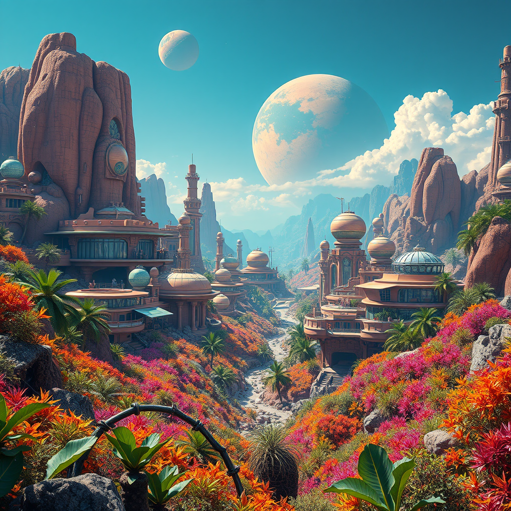 Vibrant human colony on an uncharted planet, surrounded by retro-futuristic architecture amidst a landscape of bright, vivid vegetation; the scene is hyperrealistic and exudes lush, intricate detail with imaginative elements woven into the core theme.