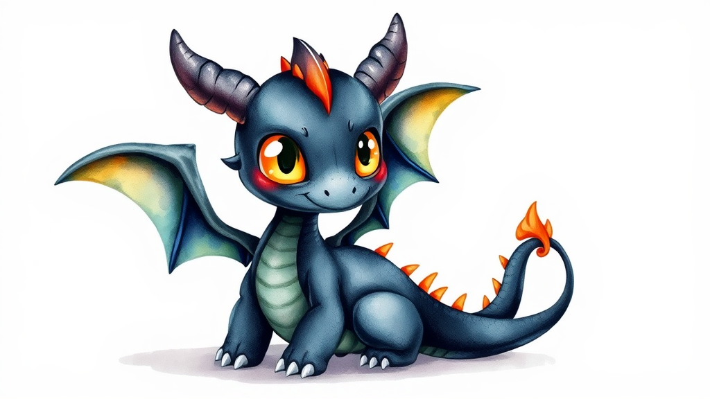 Vibrant illustration featuring a charming tiny black dragon with large, expressive yellow eyes and elegant wings, set against a minimalist white background. The dragon is rendered in an intricate ornamental watercolor style, with rich, dark hues and subtle shading that gives a whimsical, dreamlike quality. The watercolor technique enhances the dragon's playful demeanor, presenting a delightful contrast between its dark scales and the colorful accents.