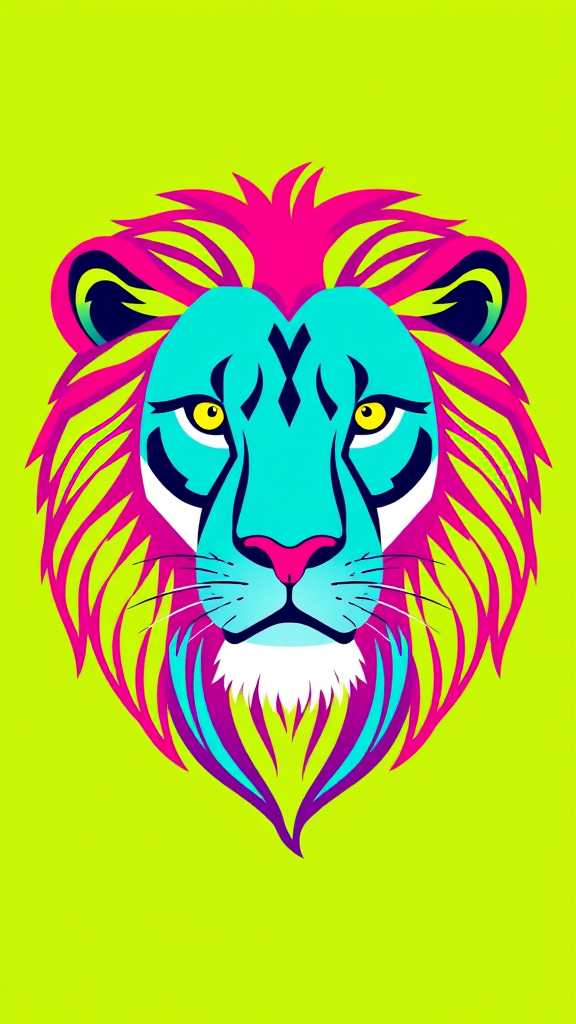 Vibrant illustration of a lion head, depicted in a bold and simple style with an imaginative color palette, featuring shades of turquoise, magenta, and lime green.