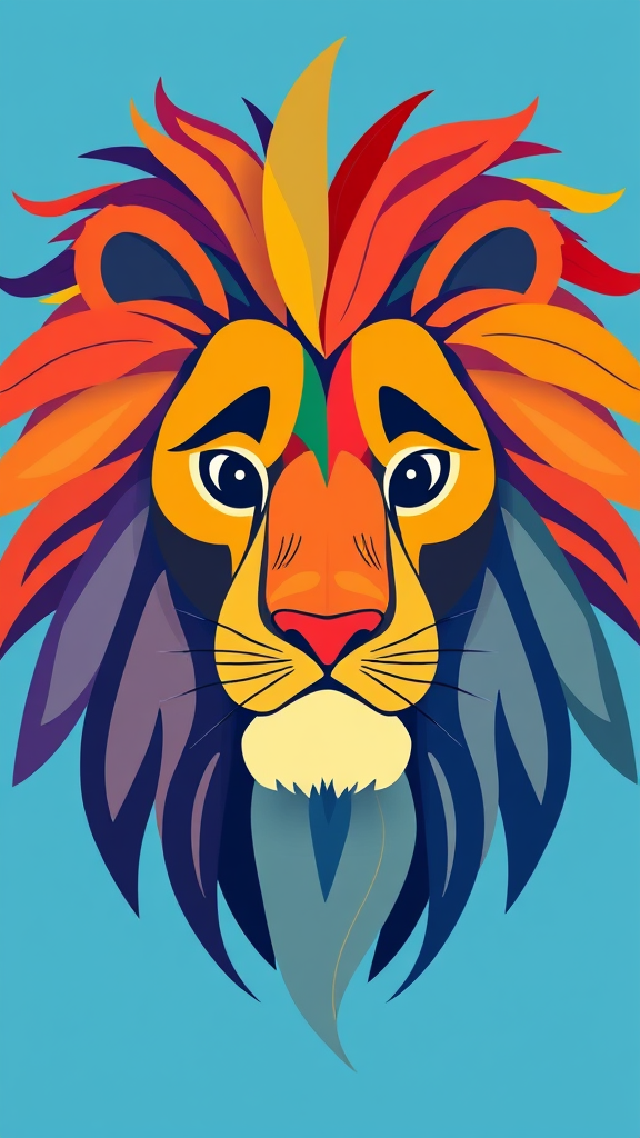 Vibrant illustration of a lion's head, showcasing a whimsical and abstract style, with an array of bold, unconventional colors that highlight its mane and expressive features, embodying a playful and modern aesthetic.