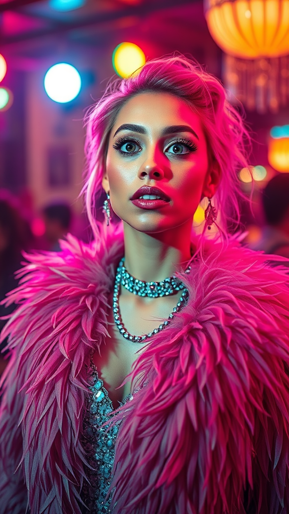 Vibrant image of an unsuspecting woman in a dazzling festival ensemble, adorned with a luxurious feathered jacket. She sports vibrant pink hair and wide, curious eyes. The scene is illuminated with colorful party lights, casting a high-saturation glow. The setting is indoors, captured in a dreamy, soft-focus style with hyper-detailed, cinematic lighting, evoking an artistic and otherworldly ambiance.