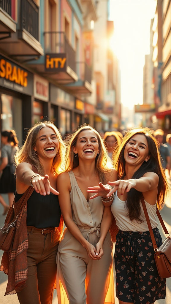 Vibrant image of three women laughing together on a bustling city street, the golden sunlight casting long shadows. They are playfully reaching out towards the camera with wide smiles, capturing a moment of joy amidst the urban chaos. The background is a blur of colorful storefronts and bustling pedestrians, adding an energetic atmosphere to the scene.