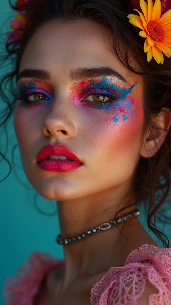 View this AI-generated image featuring vibrant and daring makeup styles featuring striking eyeshadow vivid lips and imaginative designs portrait of a woman captured with artistic flair composition guided by the rule of thirds set against a dynamic ar 4 5 backdrop infused with a touch of unpredictabi
