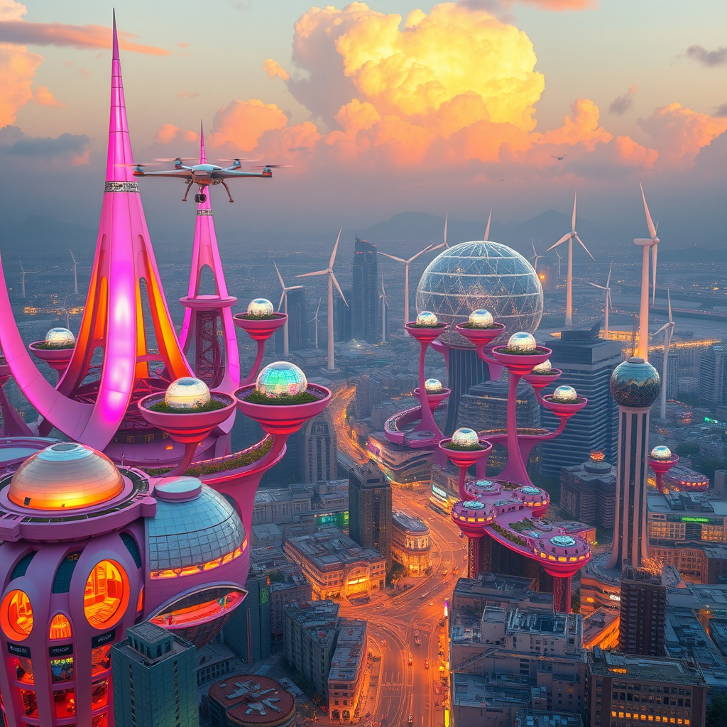 Vibrant metropolis with iridescent spires and sweeping arches of pink-tinged architecture that seem to defy gravity, as solar-powered drones and suspended gardens harmoniously coexist amidst a tapestry of interlocking domes and glowing energy orbs, where wind turbines hum softly in the background, their slender silhouettes a testament to the city's commitment to sustainable innovation, the entire scene radiating an aura of futuristic serenity and eco-friendly beauty, as wispy clouds drift lazily across the sky, casting a warm, golden glow over the entire landscape, while the urban landscapes descending from the central hub appear to be an ever-evolving, adaptive city, with vibrant street art and glowing neon signs that pepper the surface, a true marvel of futuristic urban planning