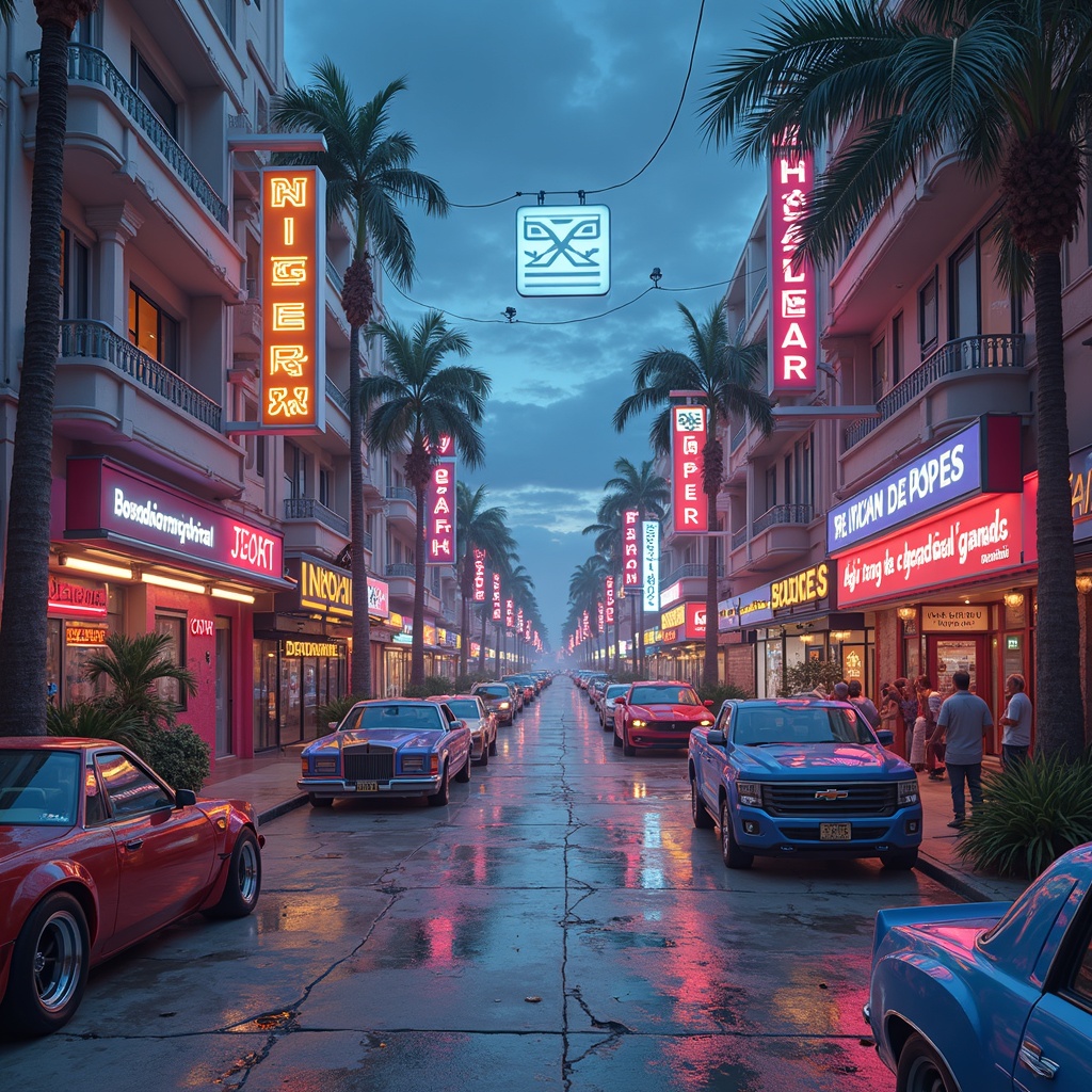 A bustling street scene in Miami, featuring classic cars parked along a wet road reflecting colorful neon signs. Palm trees line the avenue under a dramatic twilight sky, evoking a nostalgic, retro-futuristic atmosphere.