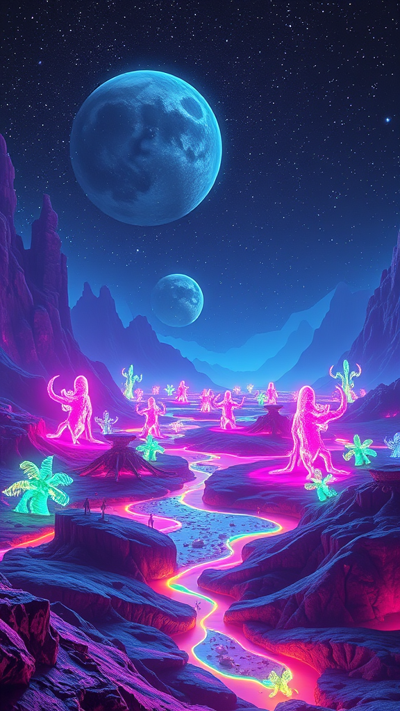 Vibrant neon-illuminated extraterrestrial world, glowing flora casting colorful reflections in a futuristic landscape, strange luminous creatures moving across vast luminescent terrains under a star-filled sky.