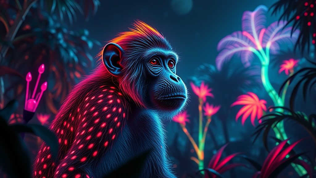 Vibrant neon monkey rendered in a surreal jungle setting, with luminescent patterns highlighting its fur under a midnight sky, as fluorescent foliage takes on an otherworldly glow in the background.